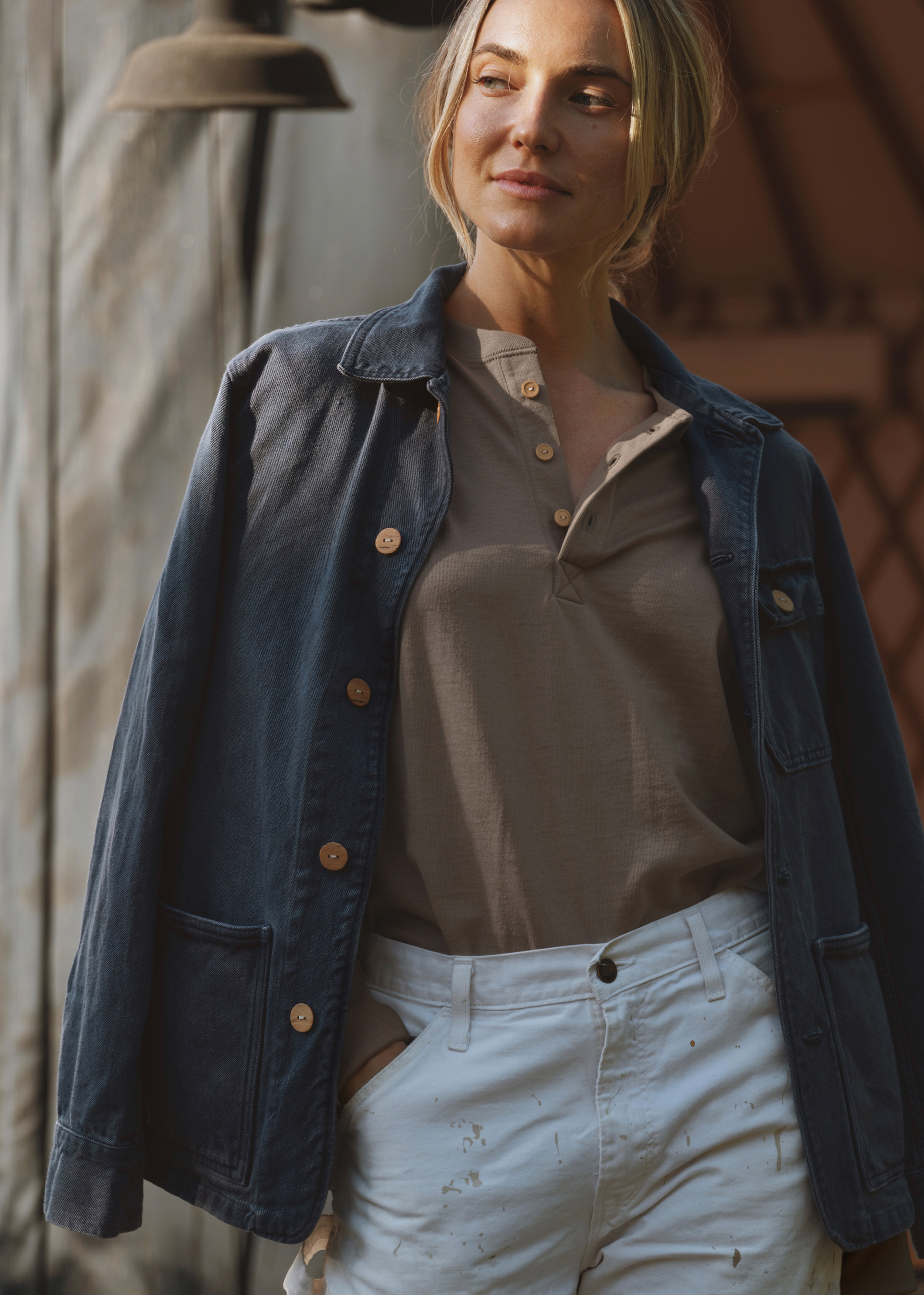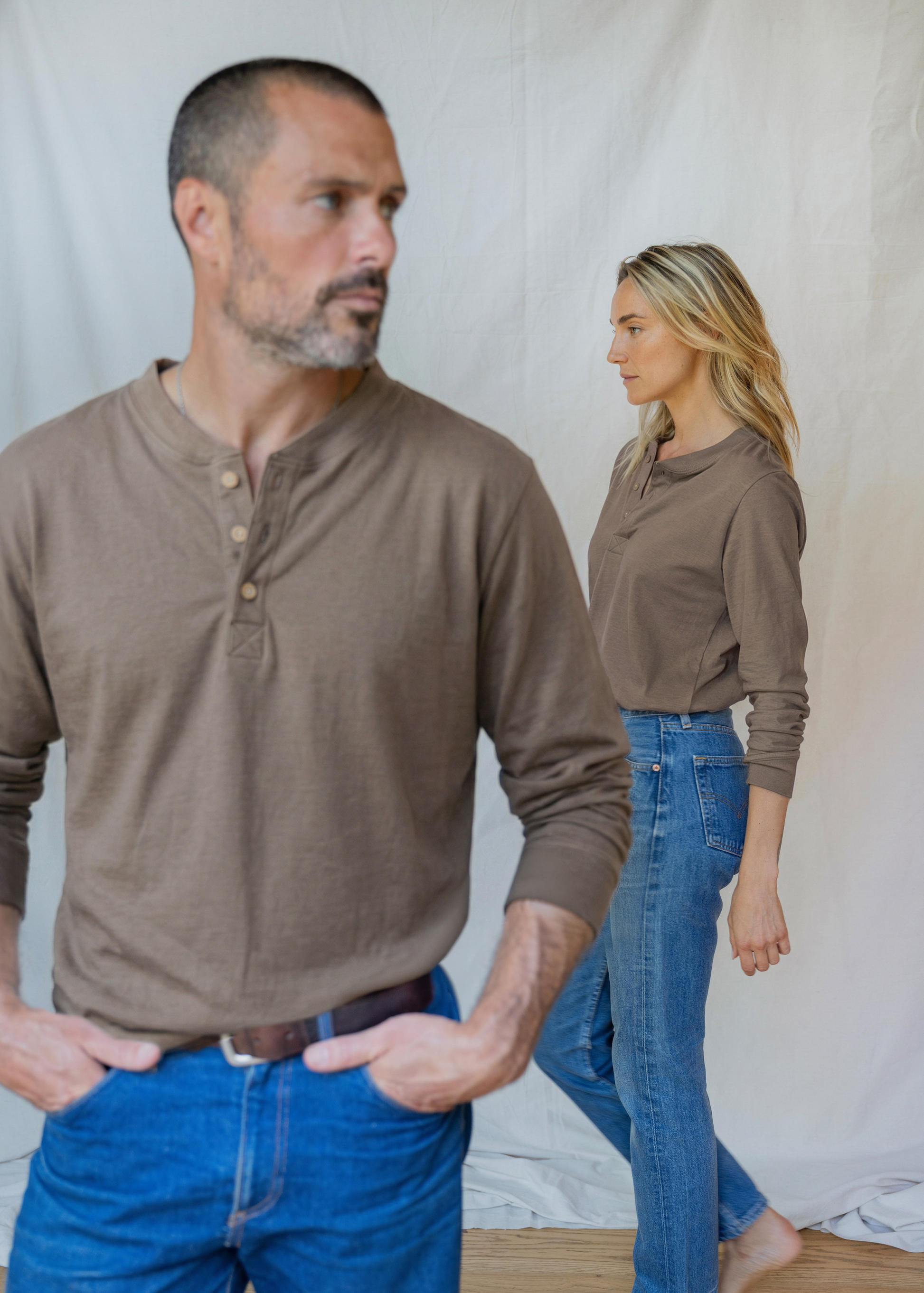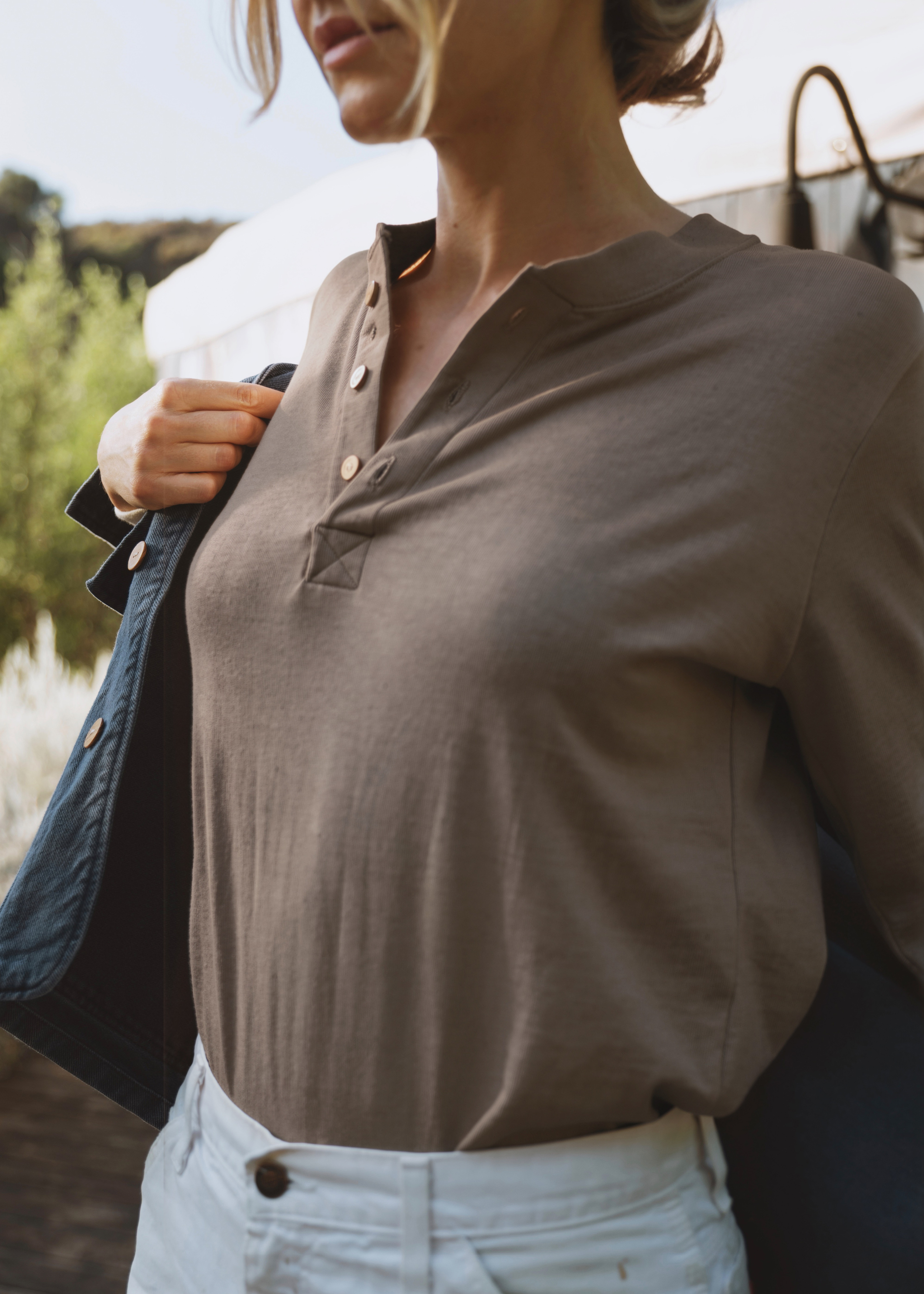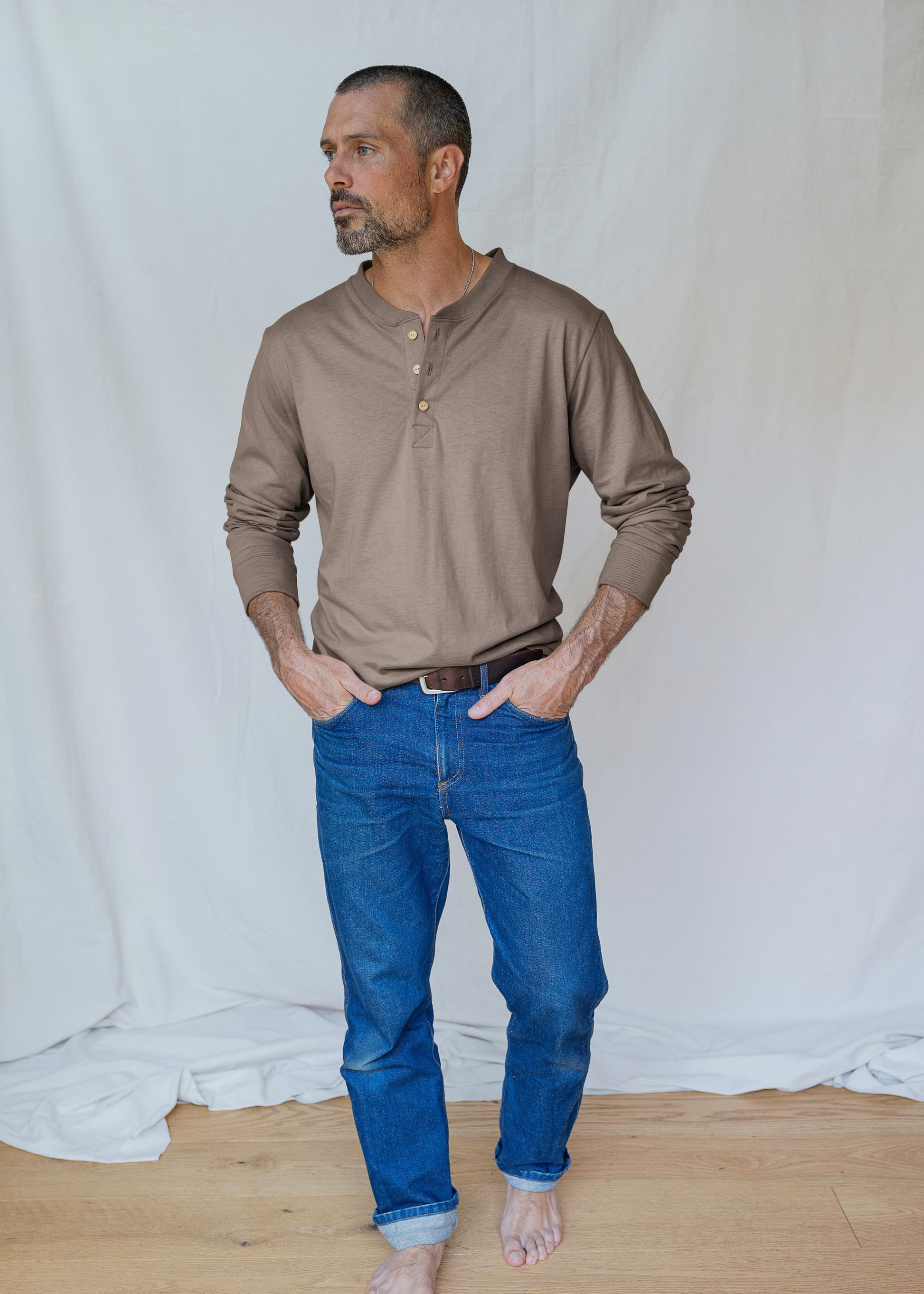 The finished fabric is then cut and sewn into garments by skilled artisans. Our knit pieces - ie: tees and sweatshirts - are crafted in Georgia with the perfect drape. While our woven pieces - ie: trousers and jackets - are tailored in Pennsylvania for a structured, timeless silhouette.
